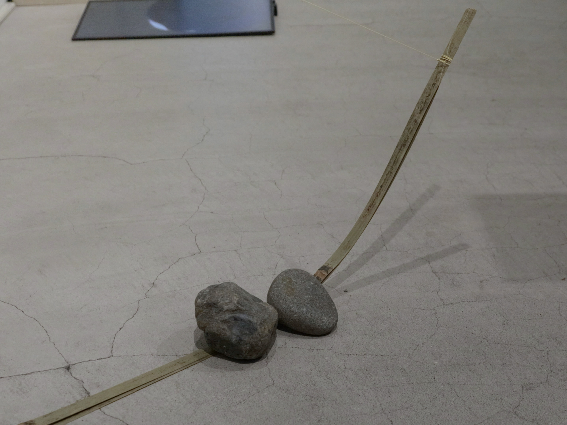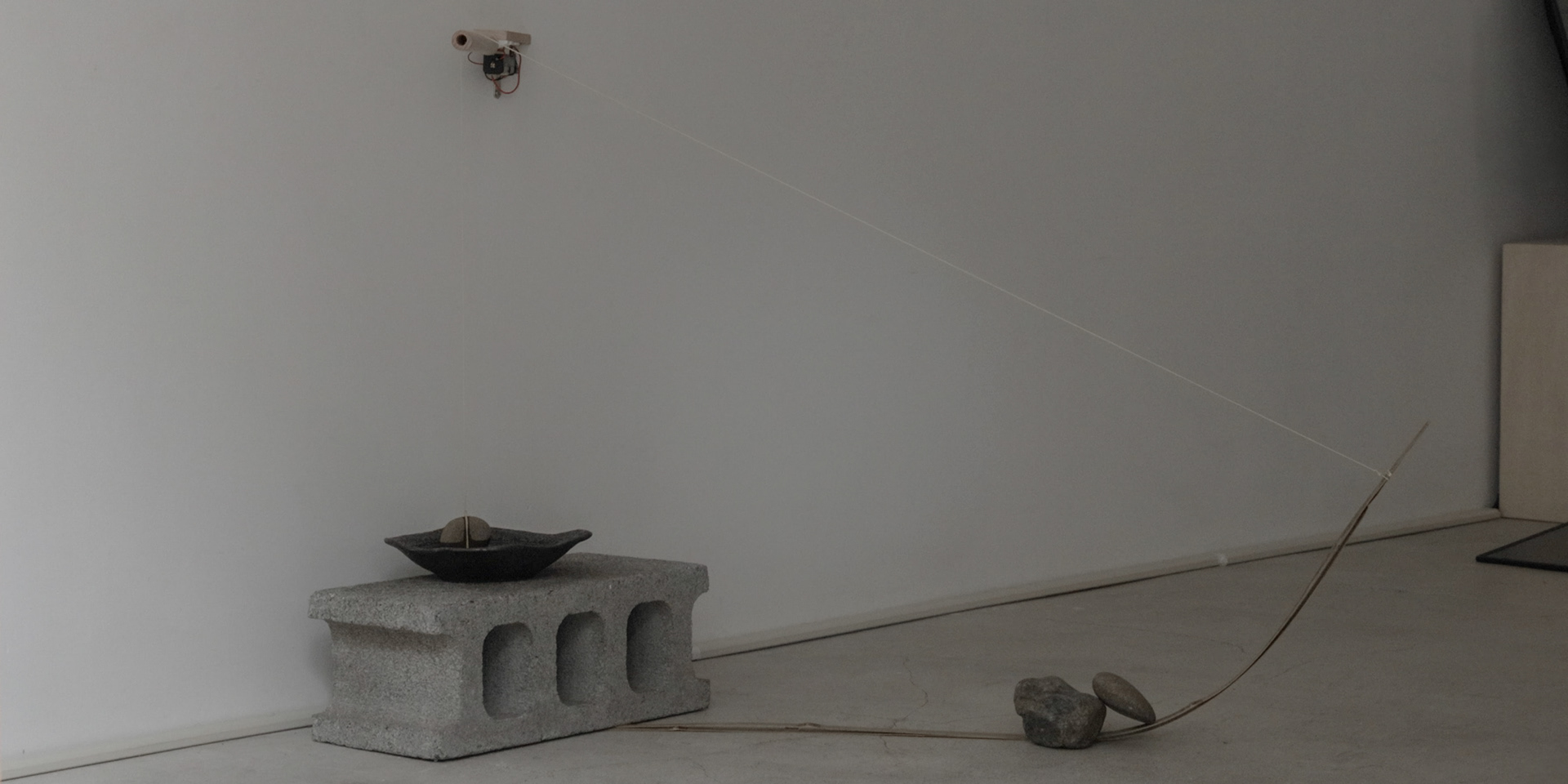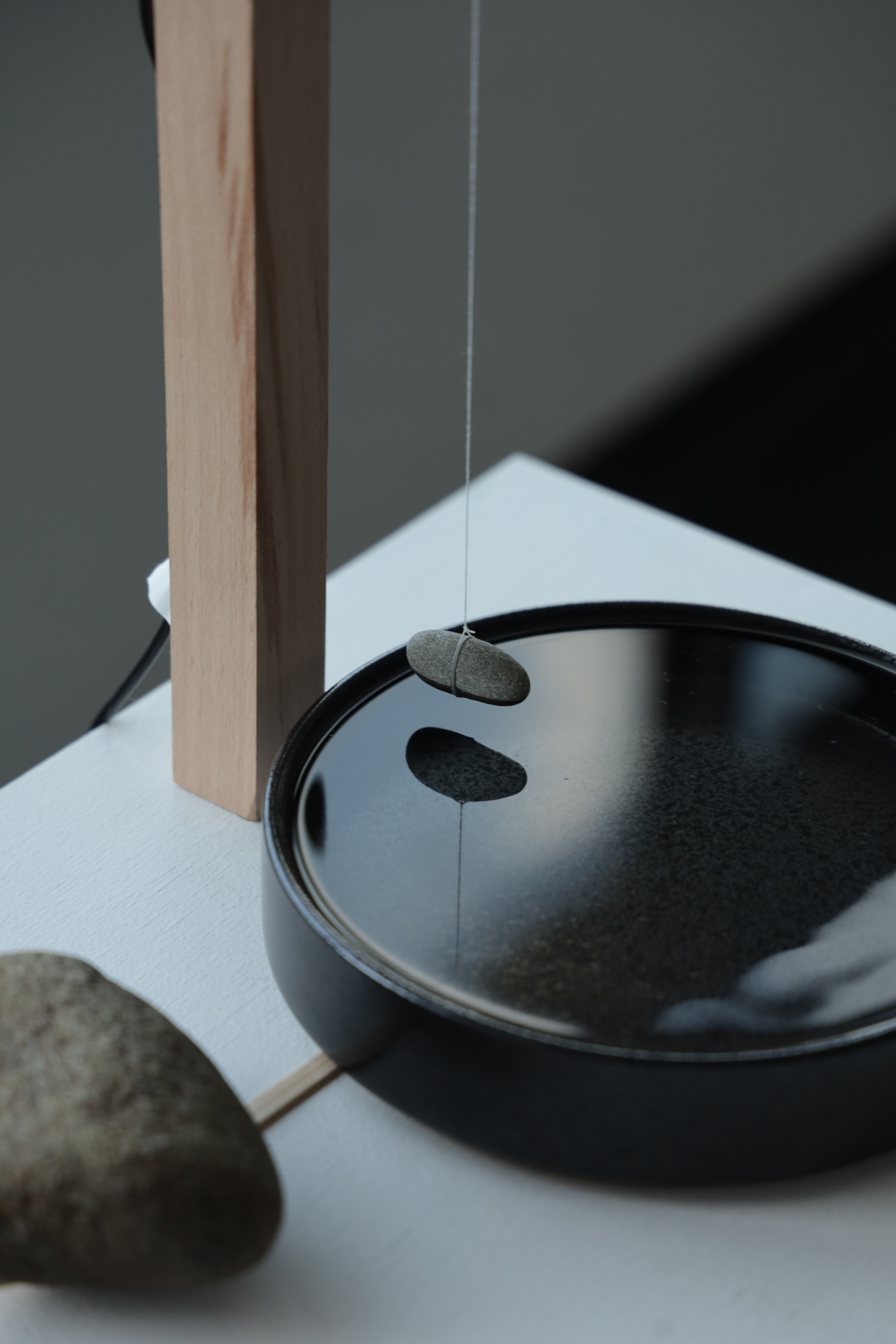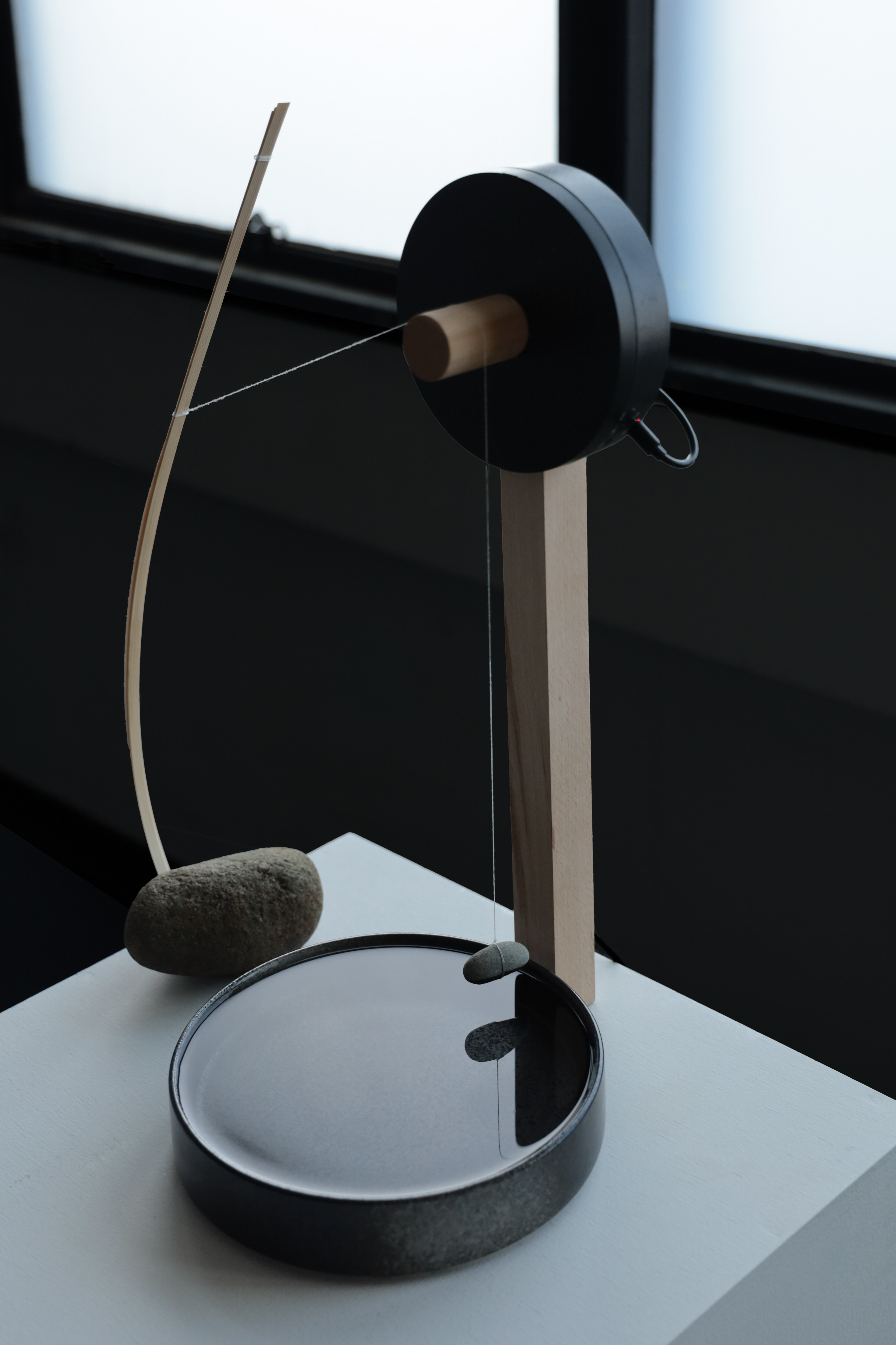 水面に浮かぶ石と竹串は一本の糸で結ばれ、糸と木との摩擦は、静止摩擦と動摩擦のあいだを絶えず行き来する。