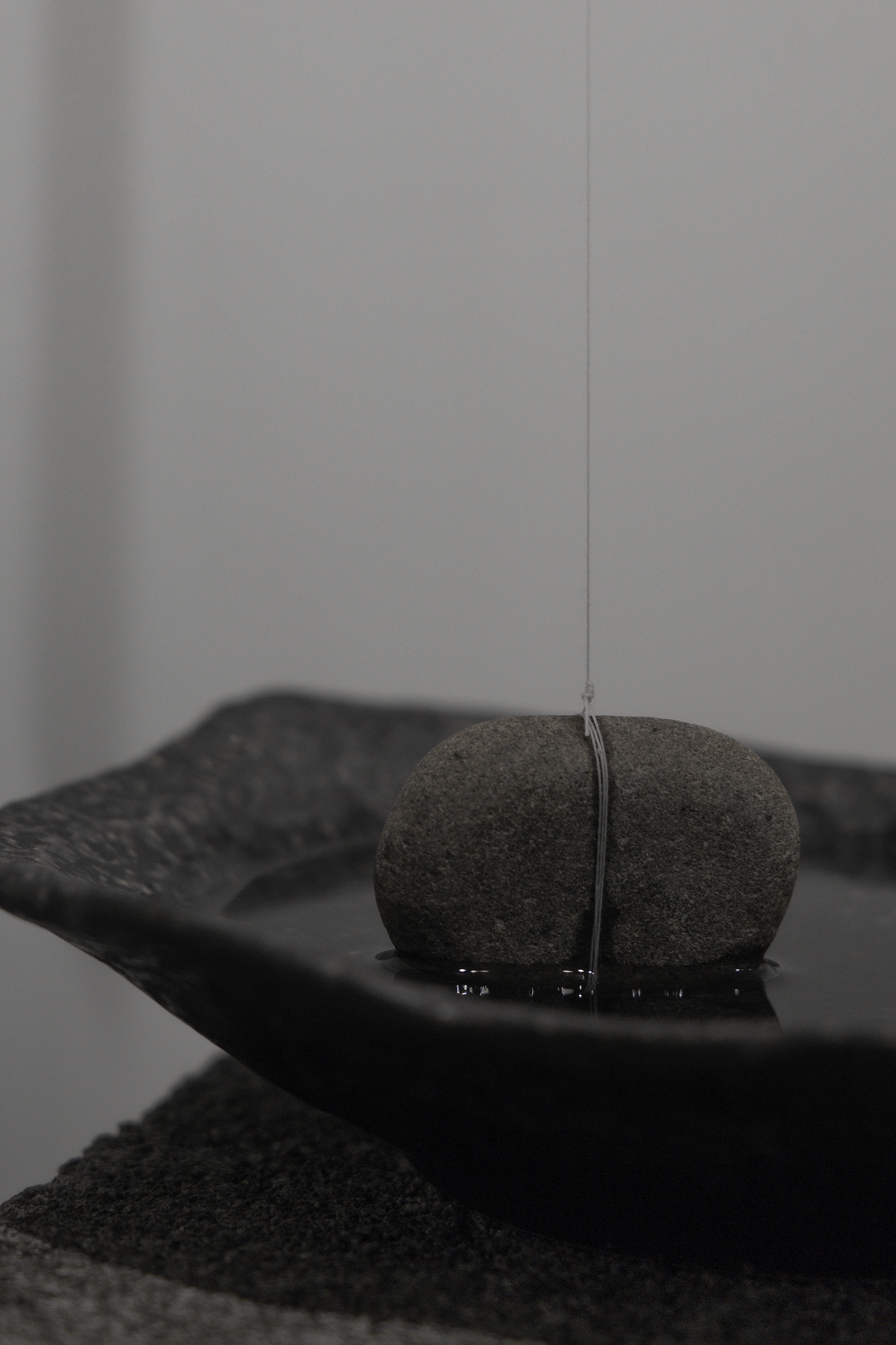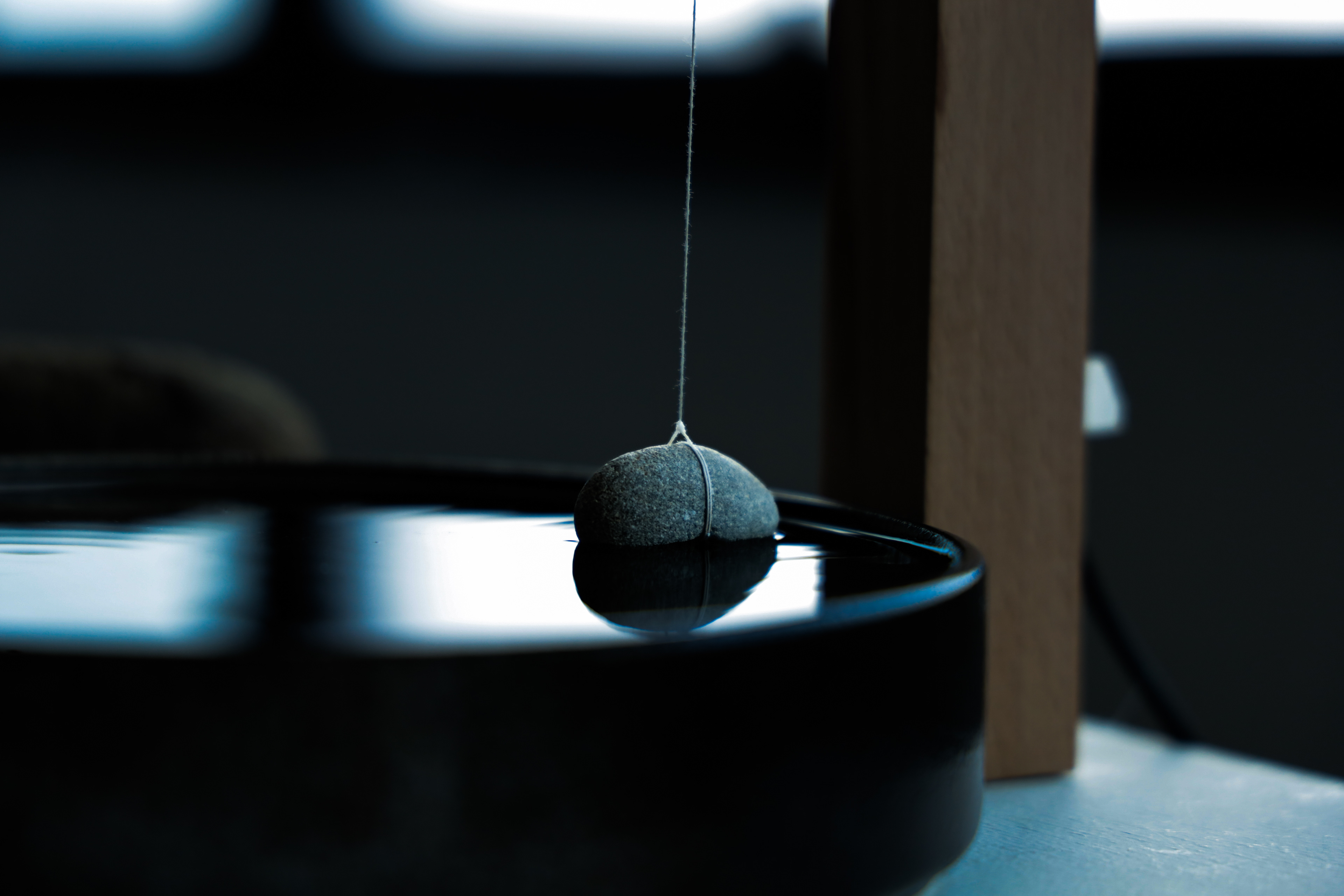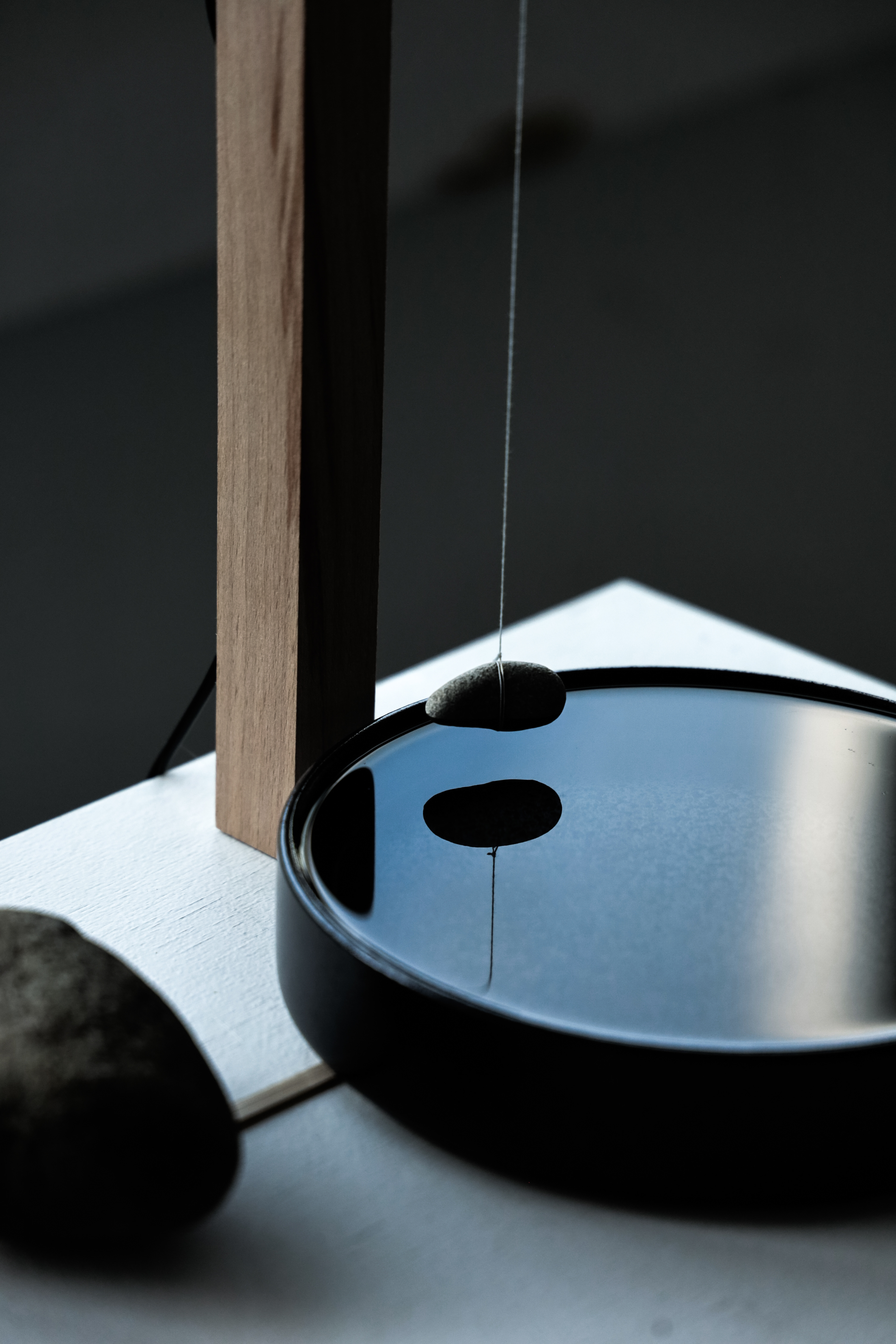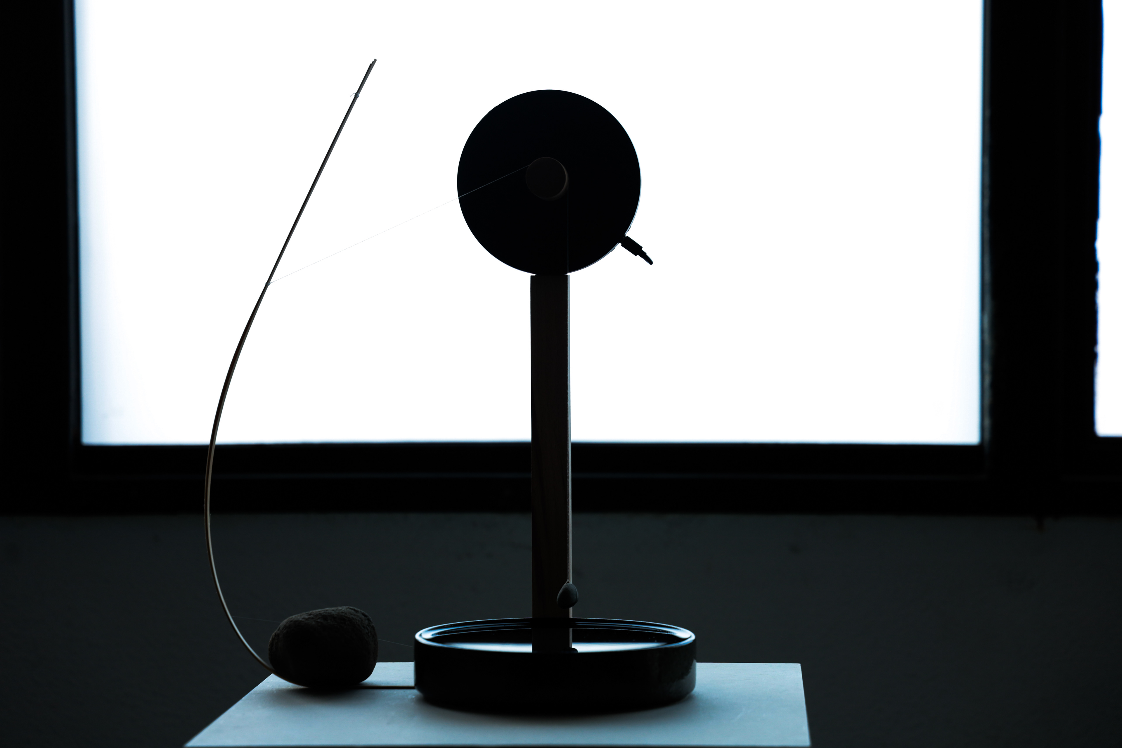 水面に浮かぶ石と竹串は一本の糸で結ばれ、糸と木との摩擦は、静止摩擦と動摩擦のあいだを絶えず行き来する。